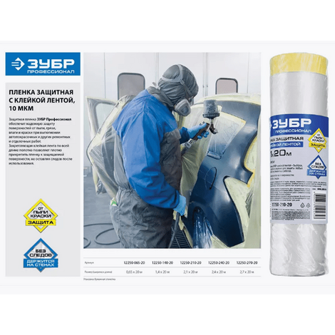 Плёнка укрывная с малярной лентой, выполненная из материалов высокого качества, от бренда ЗУБР в сфере производства высококачественных расходных материалов.
