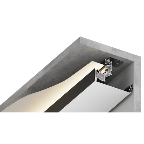 Особенностью конструкции является демпферная система фиксации нижнего полотна, позволяющая монтировать как ПВХ, так и тканевые полотна. За счет видимой части нижнего профиля появляется возможность создавать конфигурации двухуровневых потолков с прямыми углами.