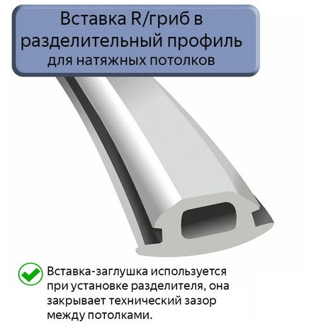 Вставка R-образная используется при установке разделителя, она закрывает технический зазор между потолками. Вставка напоминает форму гриба, своей выпуклой частью вставляется в разделитель, а широкой «шляпкой» закрывает место пристыковки потолков. Таким образом, получается аккуратно выполненное соединение полотен.